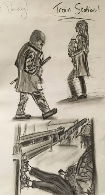 Connan set us the task of observing people in the real world, how they move and what certain characteristics to they have to make them stand out. He wanted us to sit somewhere public and select a few people to draw. I didn't really enjoy this task as I'm not very confident at drawing people as is and it was even harder as they're constantly moving. My location of choice was the train station - I can see now that the scale and proportions of these sketches are wrong as I didn't map out what I was going to draw first.